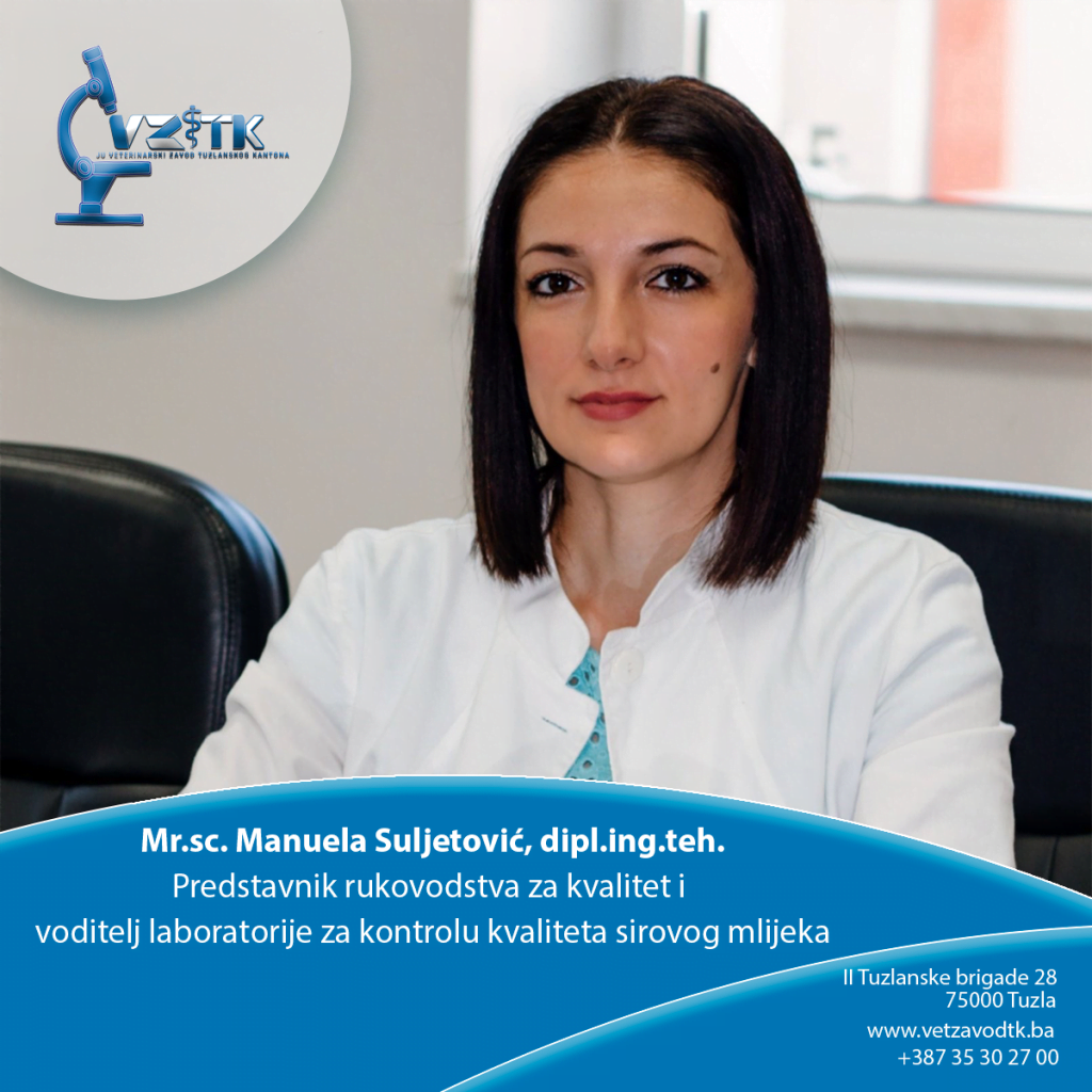 Predstavnik rukovodstva za kvalitet/Voditelj laboratorije za kontrolu sirovog mlijeka: Mr.sc. Manuela Suljetović, dipl.ing.teh.