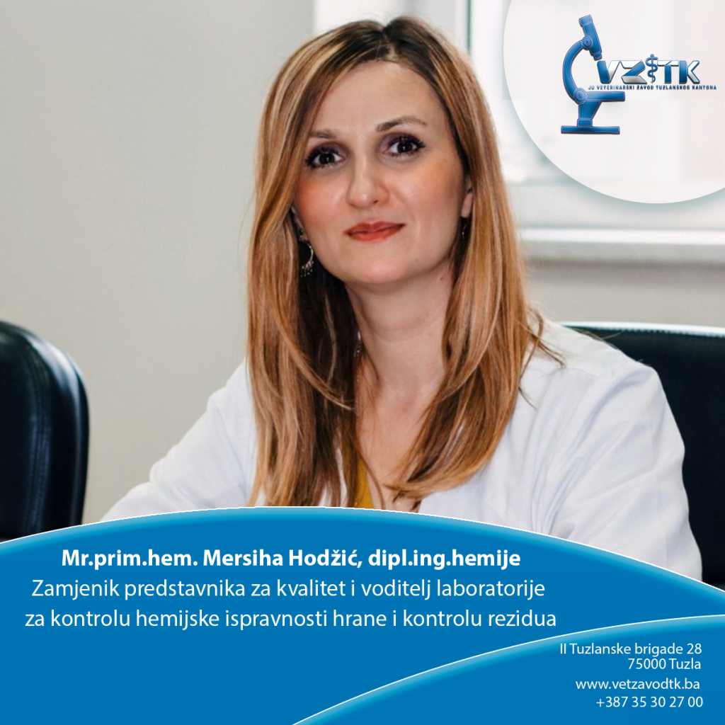 Zamjenik predstavnika rukovodstva za kvalitet/ Voditelj Laboratorije za kontrolu hemijske ispravnosti hrane i kontrolu rezidua Mr.prim.hem. Mersiha Hodžić, dipl.ing.hem.
