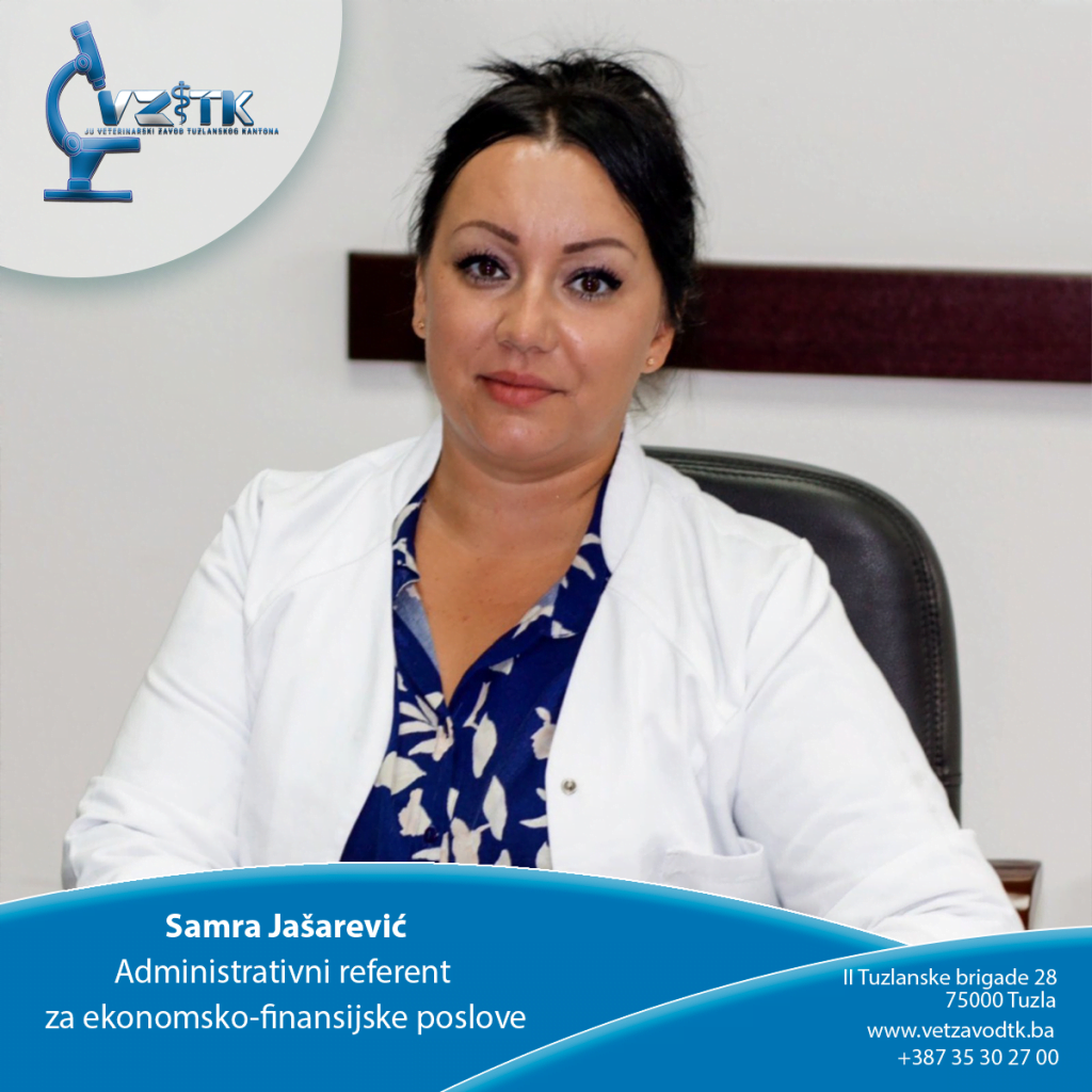 Samra Jašarević rođena je 24.08.1987 god u Bijeljini. U JU Veterinarski zavod TK Tuzla je zaposlena od juna 2008 . god kao Mlađi referent za ekonomsko finansijske poslove.